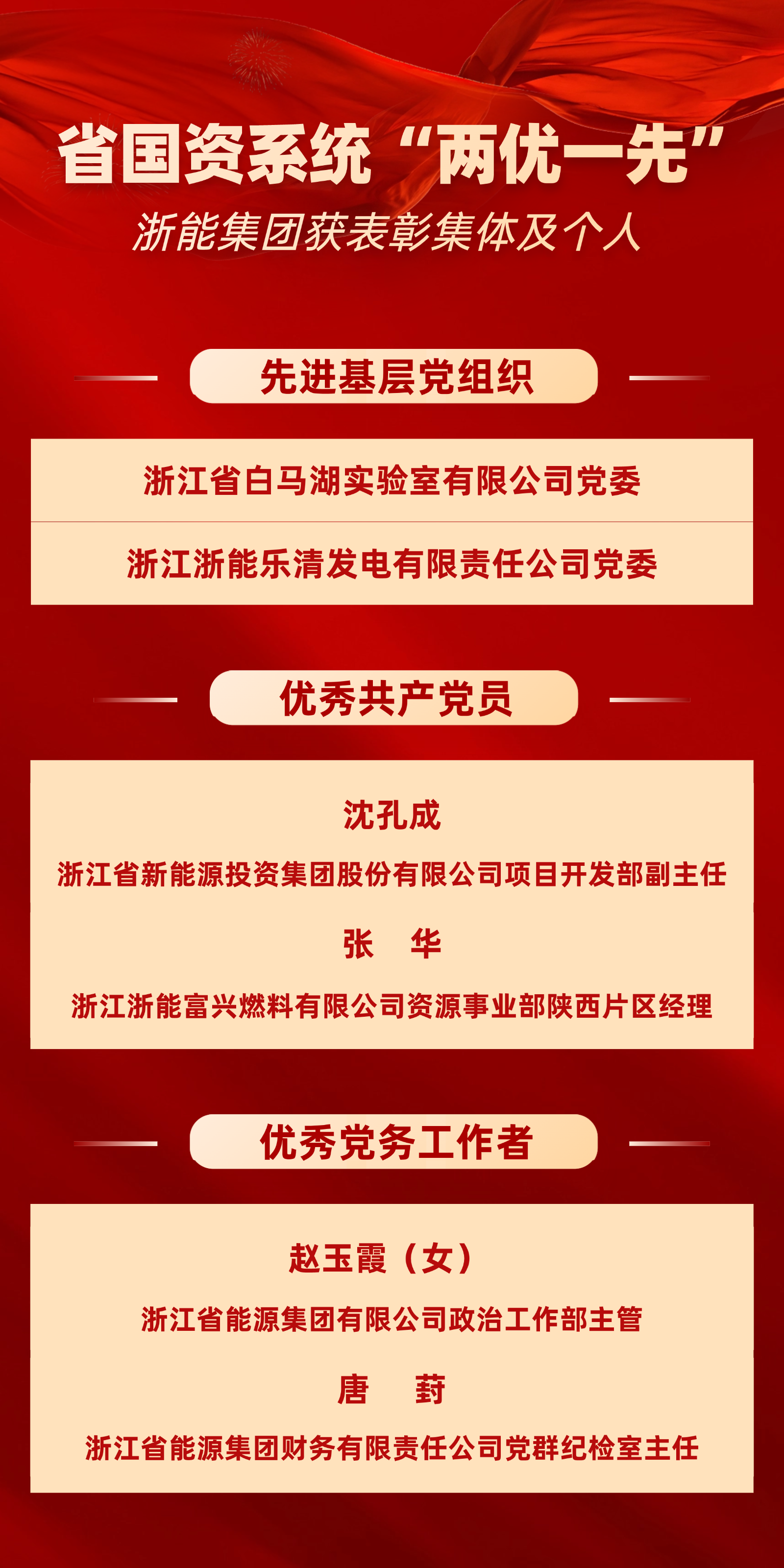 本網訊 日前,浙江省國資委黨委公布“浙江省國有企業優秀共產黨員、優秀黨務工作者和先進基層黨組織表彰對象名單”,浙能集團2個集體獲評“先進基層黨組織”、2名個人獲評“優秀共產黨員”、2名個人獲評“優秀黨務工作者”。