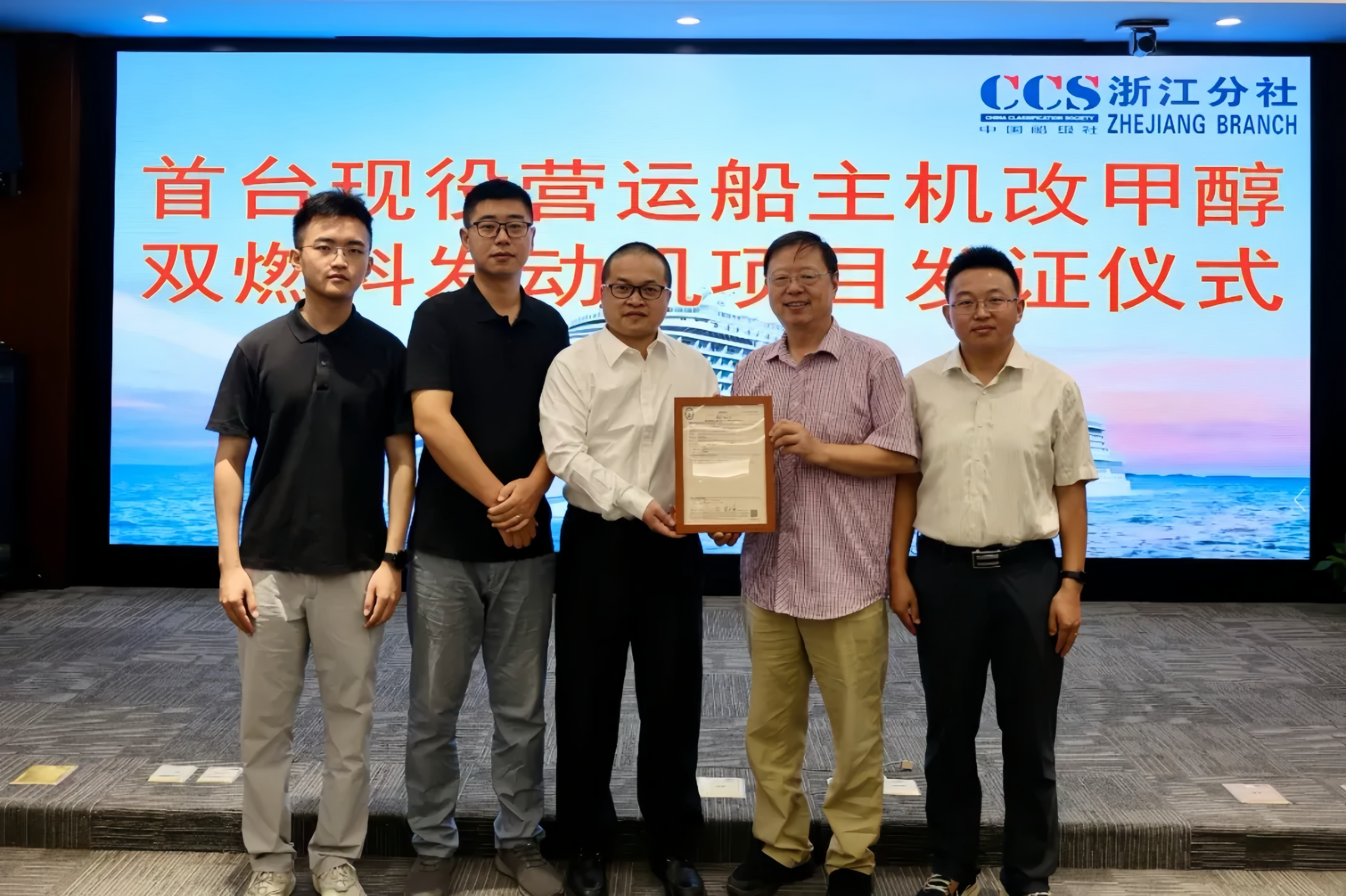 本網(wǎng)訊 “雙碳”戰(zhàn)略目標下,航運行業(yè)的綠色低碳轉型是大勢所趨。8月19日,從中國船級社(CCS)傳來喜訊,浙能邁領“領先1”輪主機獲頒首臺現(xiàn)役營運船主機改裝為甲醇雙燃料發(fā)動機項目證書,這也是繼今年7月浙能自主研發(fā)“油改電”內河貨船試航成功后,在綠色航運領域取得的又一重大突破。