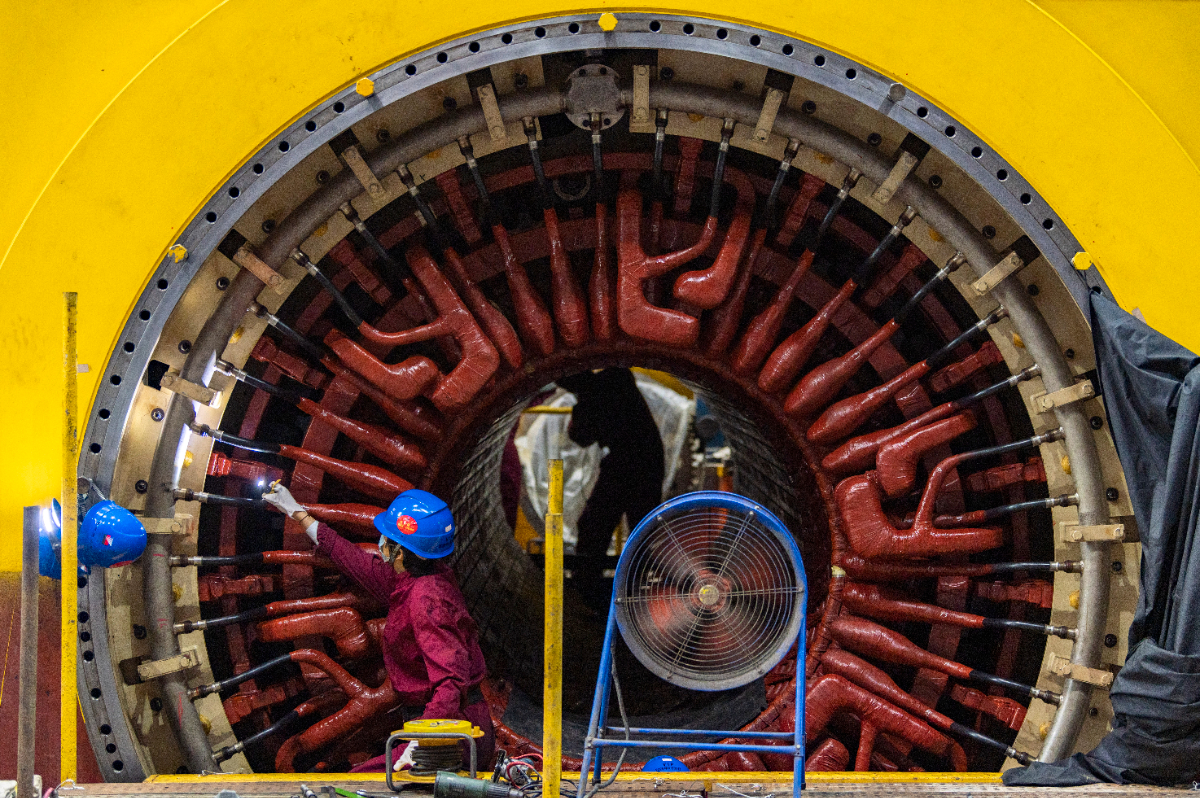 蘭電公司全力推進3號機組C修備戰迎峰度冬,圖為檢修人員在對3發電機定子鼻端絕緣與絕緣引水管磨損檢查與修復。 胡肖飛 攝