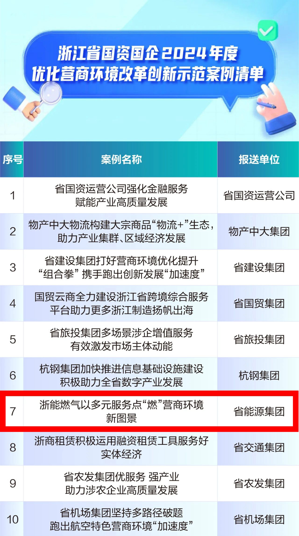 本網(wǎng)訊 近日,浙江省國資國企2024年度優(yōu)化營商環(huán)境改革創(chuàng)新示范案例發(fā)布,公布了27個展現(xiàn)浙江特色、具有推廣示范意義的案例。浙能集團報送的“浙能燃氣以多元服務(wù)點‘燃’營商環(huán)境新圖景”案例成功入圍。