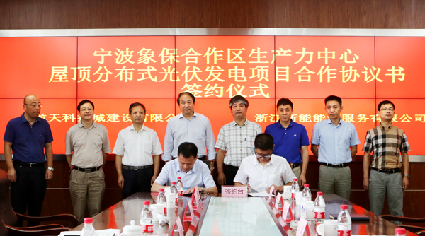 會上,浙能電力副總經理、浙能能源服務公司總經理程光坤與航天科技城建設有限公司總經理郭光磊同時簽署了《寧波象保區生產力中心屋頂分布式光伏發電項目合作協議書》,象保合作區綜合能源服務的第一個項目正式拉開序幕。
