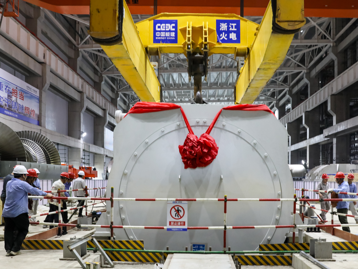 浙能臺二電二期3號機發電機定子進行起吊前準備。 俞琬 攝
