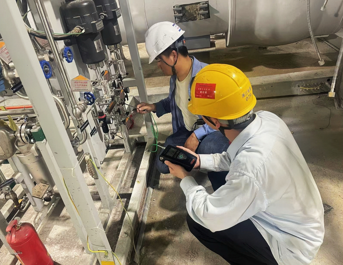 發電機氫氣系統查漏小隊成員拿著氫氣檢漏儀仔細排查各可疑漏點設備。 龔嘉沫 提供