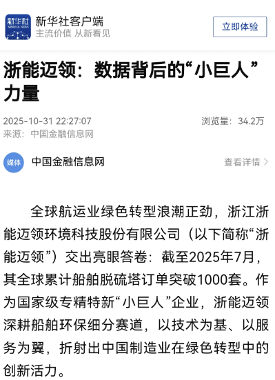 全球航運(yùn)業(yè)綠色轉(zhuǎn)型浪潮正勁,浙江浙能邁領(lǐng)環(huán)境科技股份有限公司(以下簡(jiǎn)稱(chēng)“浙能邁領(lǐng)”)交出亮眼答卷:截至2025年7月,其全球累計(jì)船舶脫硫塔訂單突破1000套。作為國(guó)家級(jí)專(zhuān)精特新“小巨人”企業(yè),浙能邁領(lǐng)深耕船舶環(huán)保細(xì)分賽道,以技術(shù)為基、以服務(wù)為翼,折射出中國(guó)制造業(yè)在綠色轉(zhuǎn)型中的創(chuàng)新活力。