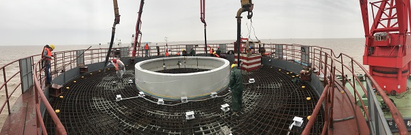 11時16分,59號機位承臺二期混凝土正式澆筑。此次承臺施工采用C40高性能海工混凝土,兩條攪拌船聯合出力,分層澆筑,一次成型。承臺直徑14.8米,二期混凝土厚度4.2米,設計方量約770立方(含樁芯混凝土)。