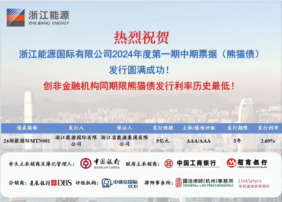 本網(wǎng)訊 3月25日,浙能集團(tuán)旗下浙江能源國際有限公司在中國境內(nèi)成功發(fā)行浙江省屬國企首單熊貓債。首期熊貓債發(fā)行5億元人民幣,期限3年,票面利率2.6%,創(chuàng)非金融機構(gòu)同期限熊貓債發(fā)行利率歷史最低。