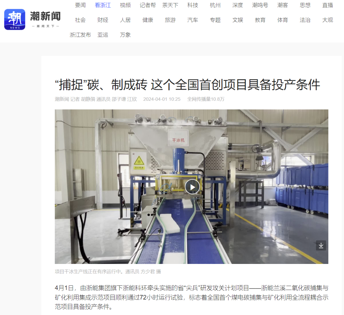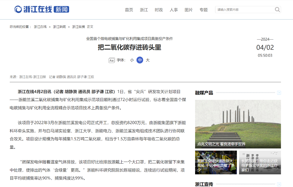 近日,浙能蘭溪二氧化碳捕集與礦化利用集成示范項目順利通過72小時運行試驗,標(biāo)志著全國首個煤電碳捕集與礦化利用全流程耦合示范項目在技術(shù)上具備投產(chǎn)條件,項目新聞獲新華社、人民網(wǎng)、浙江日報、中國能源報、潮新聞、浙江國資公眾號、騰訊網(wǎng)、搜狐網(wǎng)、今日頭條、浙江在線等平臺聚焦。