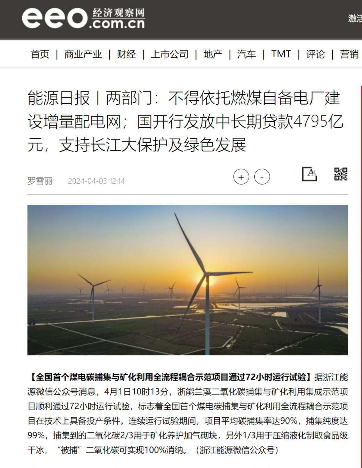 4月3日,經(jīng)濟觀察網(wǎng)能源日報專欄轉(zhuǎn)載報道《全國首個煤電碳捕集與礦化利用全流程耦合示范項目通過72小時運行試驗》。 經(jīng)濟觀察網(wǎng) 圖