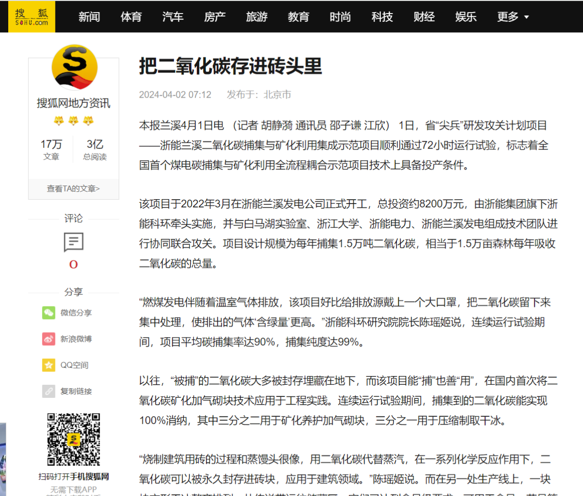 4月2日,搜狐網(wǎng)轉(zhuǎn)載報道《把二氧化碳存進磚頭里》。 搜狐網(wǎng) 圖