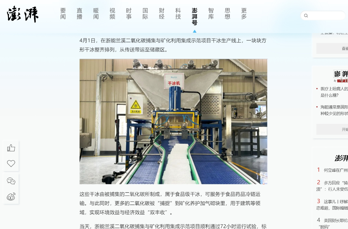 4月1日,蘭溪新聞網(wǎng)報道《蘭溪這個“捕碳高手”堪比1.5萬畝森林:每年捕集1.5萬噸二氧化碳且100%消納利用》。 蘭溪新聞網(wǎng) 圖