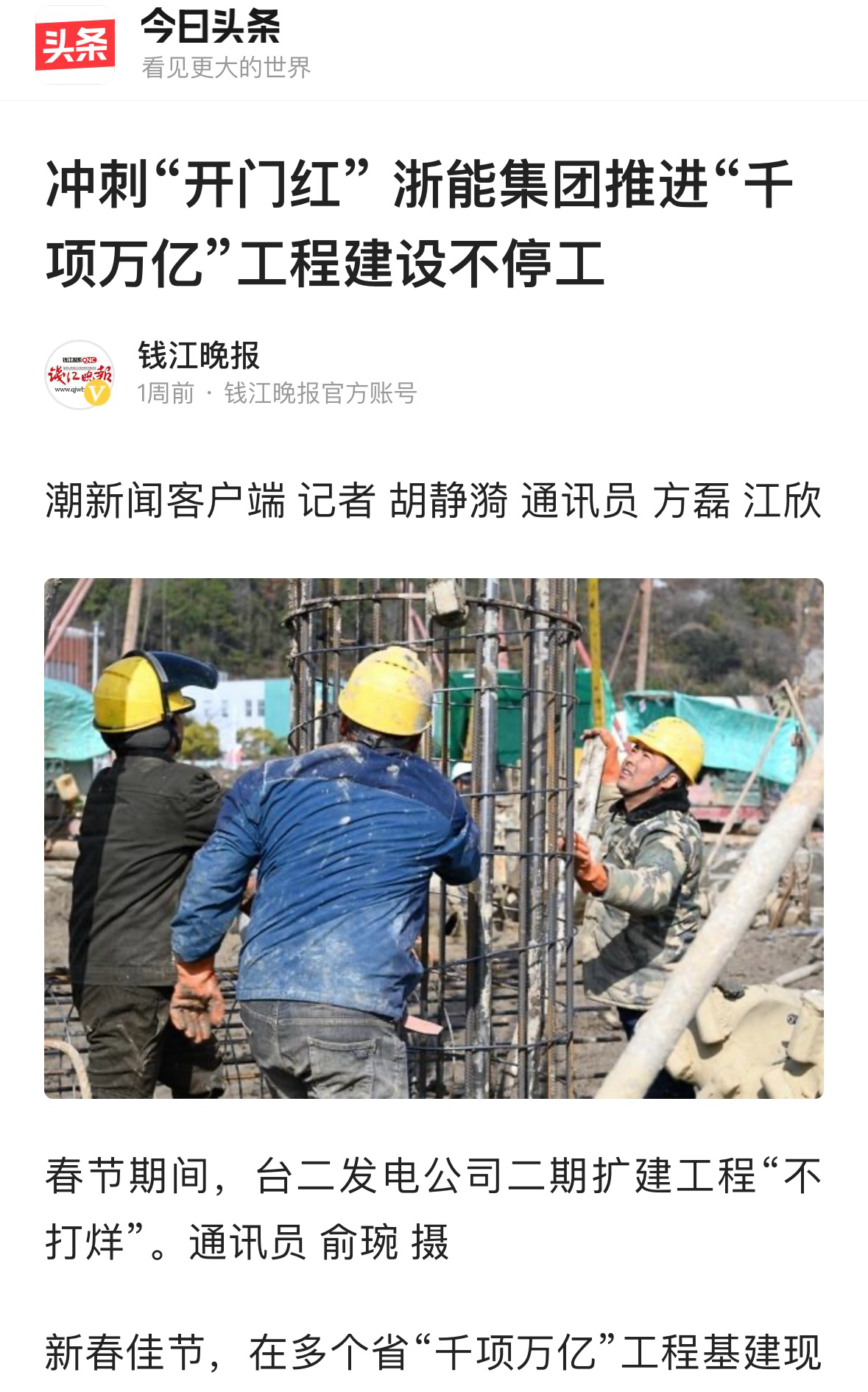 今日頭條報道《沖刺“開門紅”浙能集團推進“千項萬億”工程建設不停工》。 今日頭條 圖