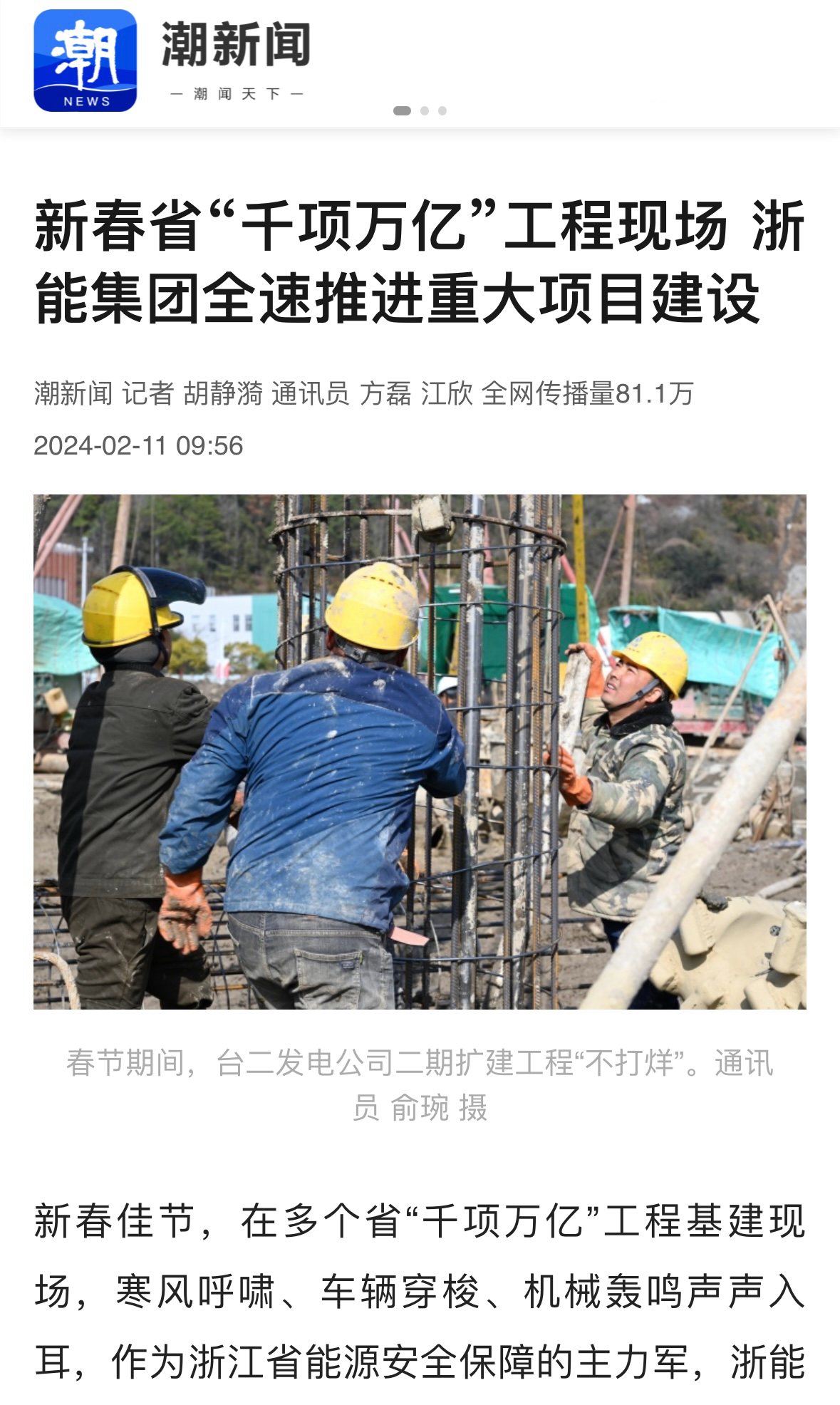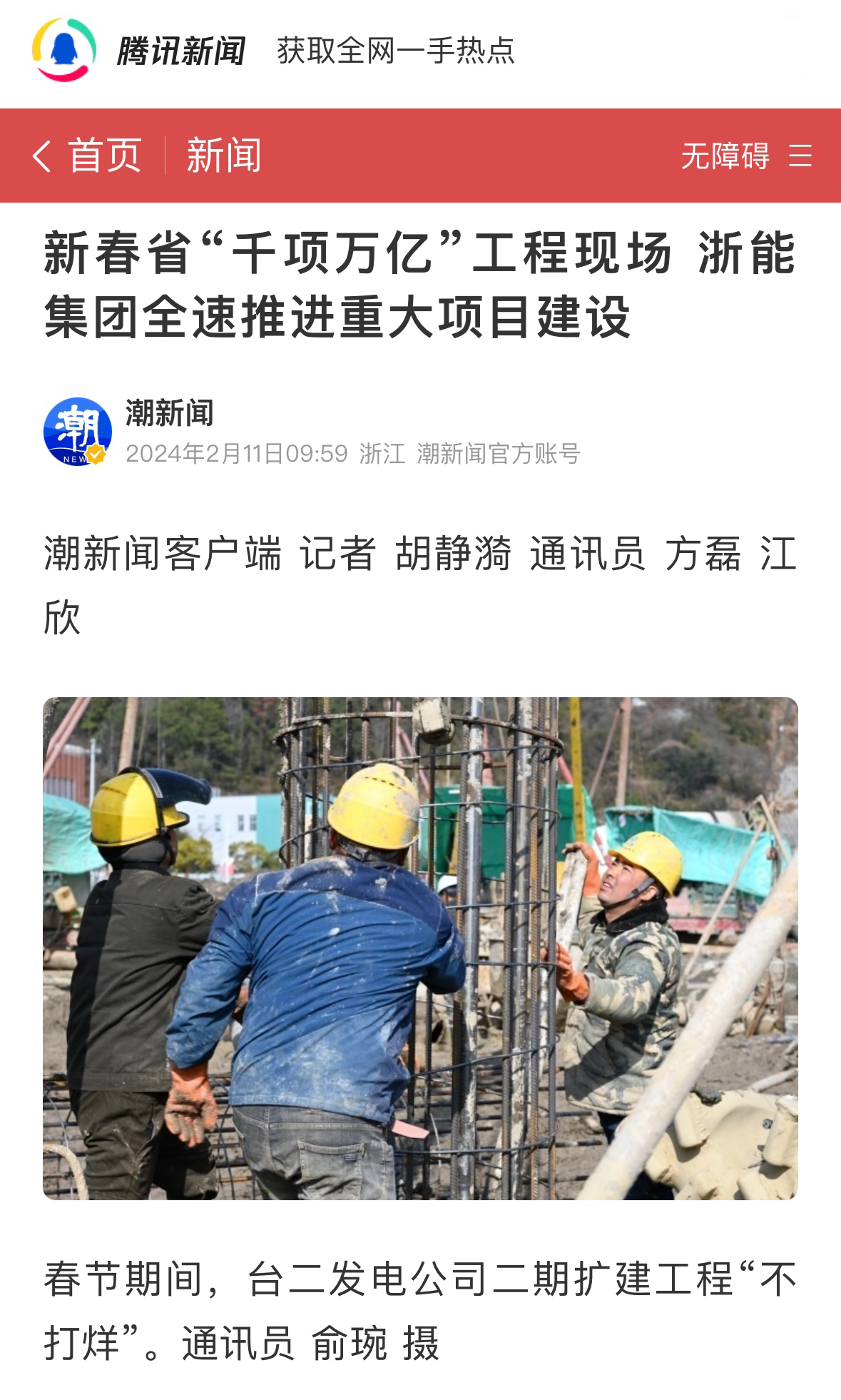 騰訊新聞報道《沖刺“開門紅”浙能集團推進“千項萬億”工程建設不停工》。 騰訊新聞 圖