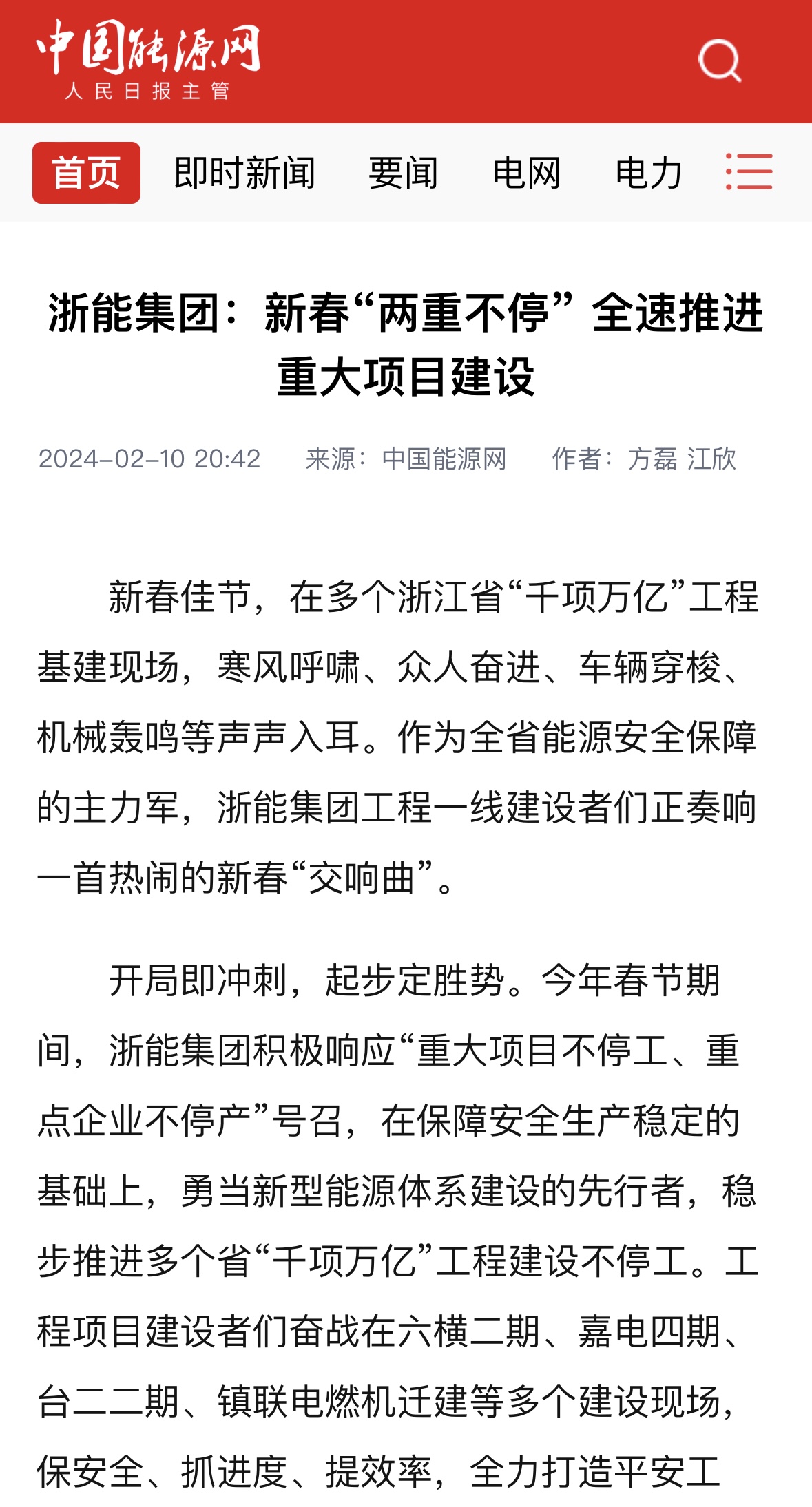 中國能源網報道《浙能集團推進“千項萬億”工程建設不停工》。 中國能源網 圖