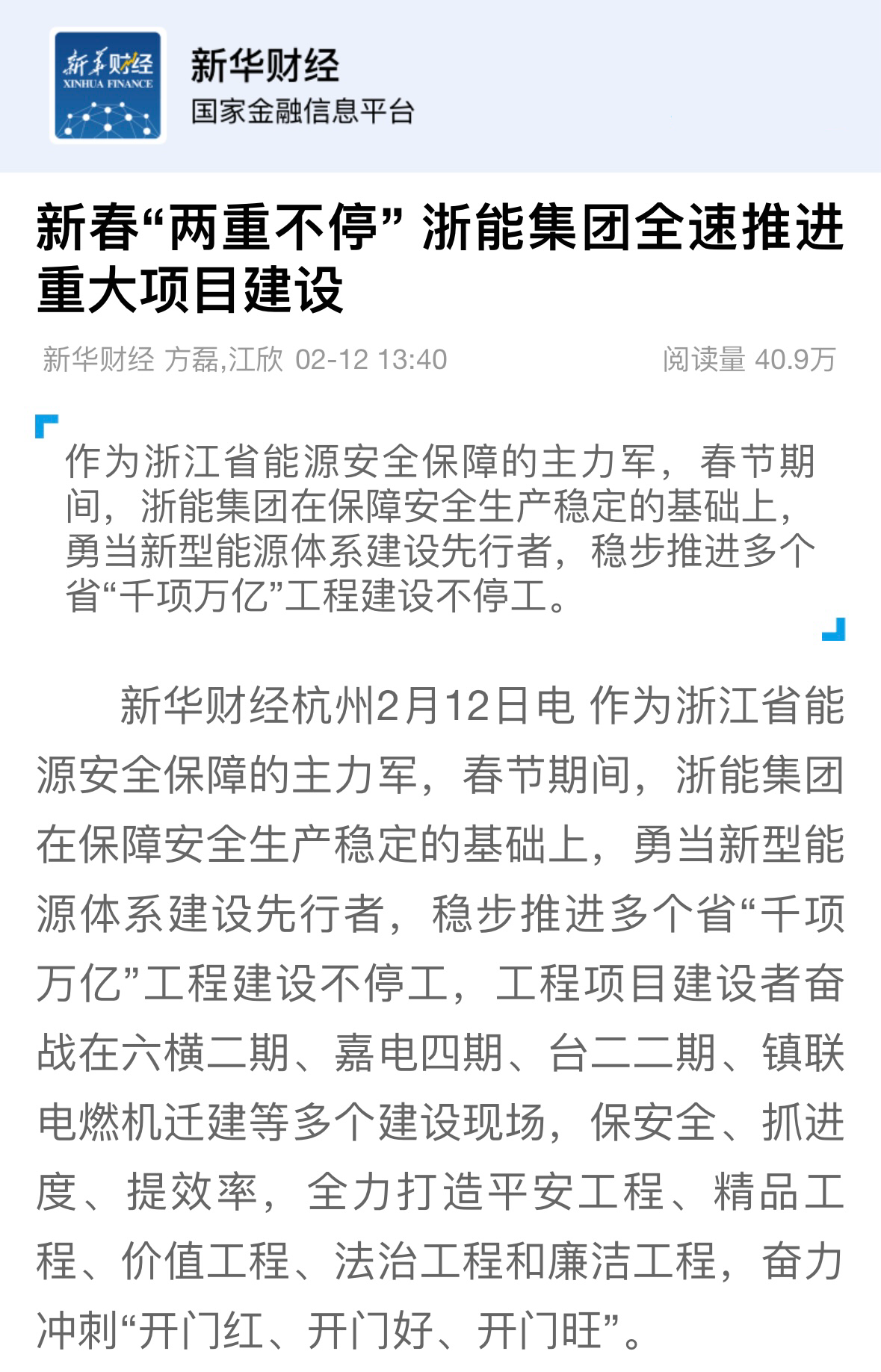 新華社新華財經報道《浙能集團推進“千項萬億”工程建設不停工》。 新華財經 圖