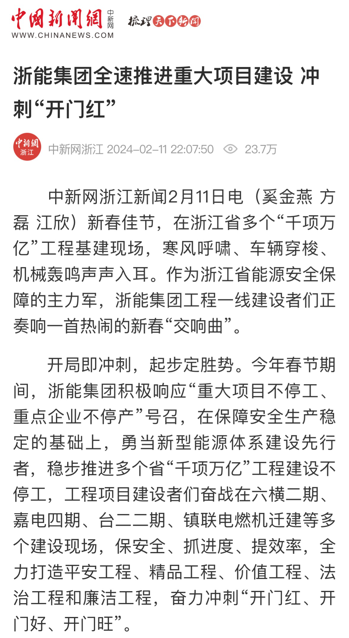 中國新聞網報道《浙能集團推進“千項萬億”工程建設不停工》 中國新聞網 圖